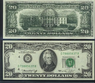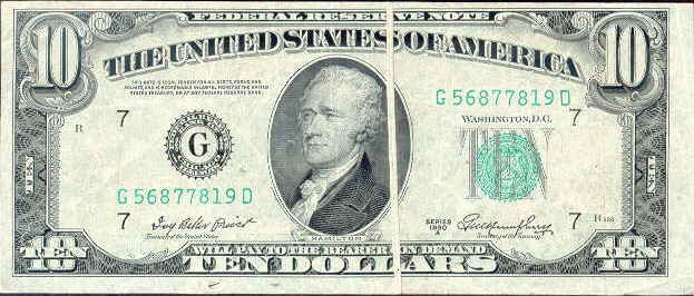 | Gutter folds are one of the most common currency manufacturing error. It is caused by a fold in the paper at the time of printing. When the folded part is opened there is a blank streak or line where the paper was folded. Though simple gutter folds, similar to this 1950A Federal Reserve note are common, large gutter folds can be quite spectacular. Approximate value range for this simple gutter fold: $30 - $65 |