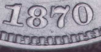 A misplaced date is typically a coin that exhibits digits or letters punched into a position on the die where they do not belong, such as this 1870 Indian cent, with more than 20 digits punched in the denticles below the date. There are also varieties known with date punches in the bust, in the rock (on Liberty Seated coinage), and even in Liberty’s hair.