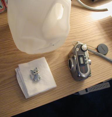 Here is another way of using the jug - here I use a halogen contractor's light to provide the lighting, and the jug to diffuse it. The subject is a serving spoon, I wanted to get the hallmark on the handle.